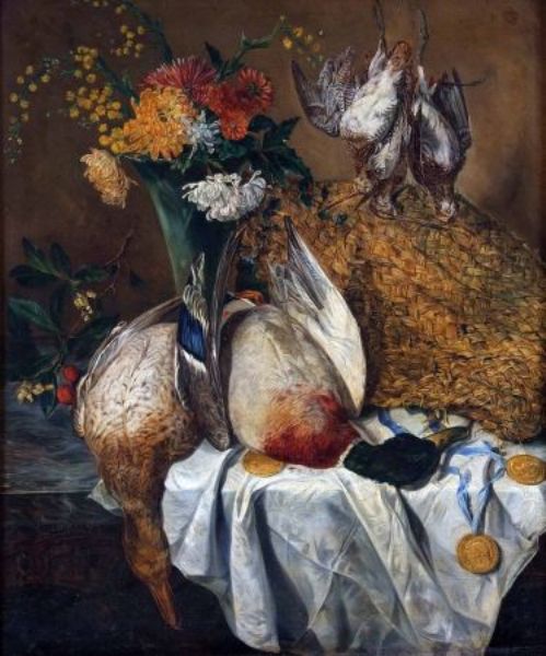 Still Life Study of Mixed Flowers, Basket and Dead Game on a Table Ledge
