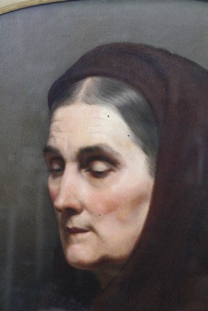 Portrait of a Lady wearing a head shawl, a stick in her right hand