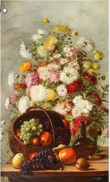 | Still life with chrysanthemum in a vase and a basket with grapes and apples | |