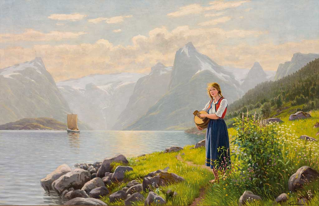 Mädchen in nordischer Tracht vor Fjordlandschaft
