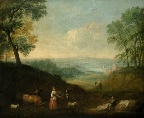 Hirten mit Tieren in einer Landschaft
