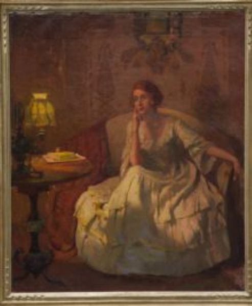 Interno con gentildonna assisa a fianco di un tavolino