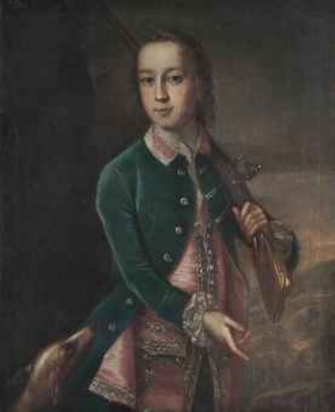 | Portrait of a boy in a green velvet coat, three-quarter-length, holding a gun, a dog to his side, in a landscape | |