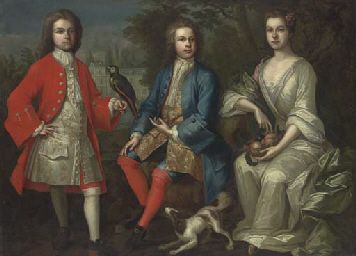 | Portrait of a gentleman in a red coat with a parrot, a gentleman beside in a blue coat, a dog at his feet and a lady in a white | |