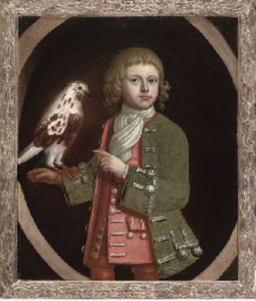 | Portrait of a young boy, three-quarter-length, in a green coat and red waistcoat, a bird on his arm, feigned oval | |