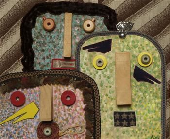 Acrylic cloth, wood, felt, metal and found object collage on board