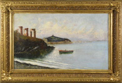 COASTAL LANDSCAPE WITH A BOAT A RUINS