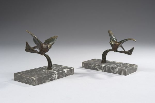Serre-livres en bronze à patine vert et doré, socle en marbre gris