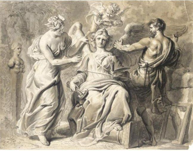 AN ALLEGORY OF THE ARTS, WITH IRIS AND GEOMETRY ATTENDING THE THREE-HEADED FIGURE OF PAINTING AND SCULPTURE, A PUTTO CROWNING HE