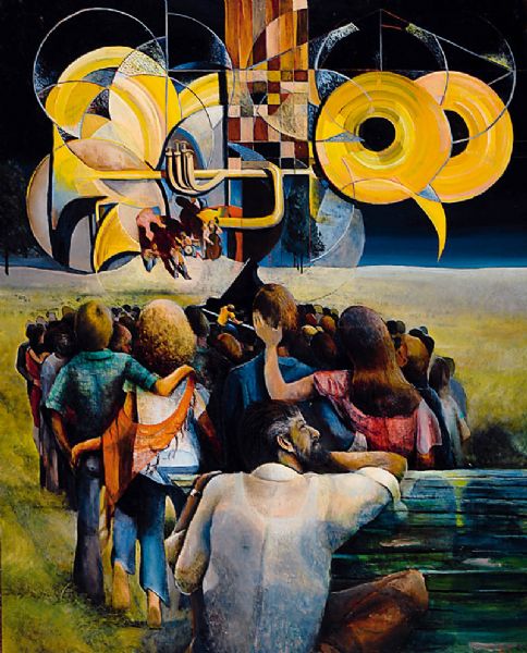 Menschenmenge vor abstrakt-surrealistischem Objekt