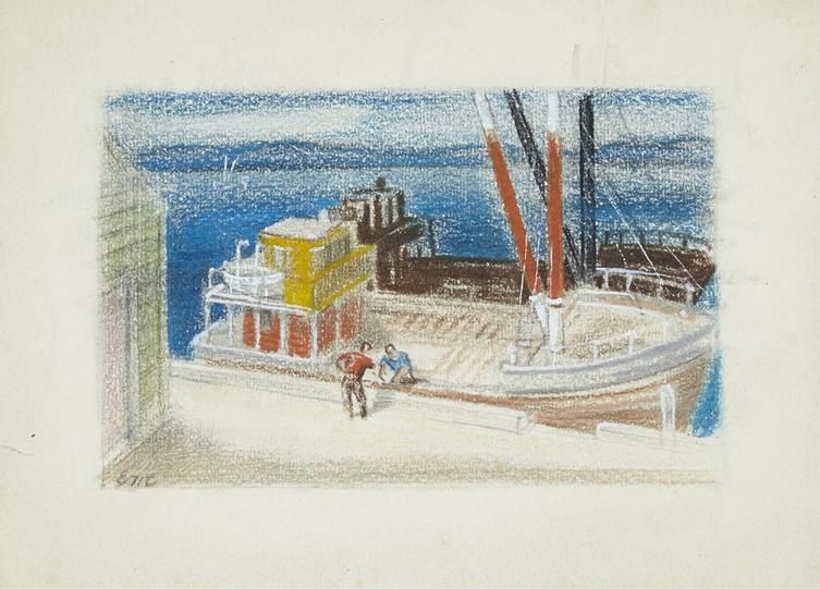 | A GROUP OF THREE DRAWINGS: BOAT AT THE QUAY; FISHERMAN ON THE SLIPWAY; SEATED WOMAN AND SAILBOATS | |