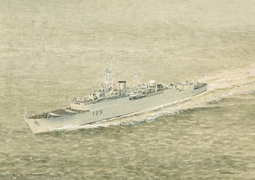 | H.M.S. Verulam and other ships escorting H.M. The Queen in the Royal Yacht 'Britannia' after her world coronation tour 1953 | |