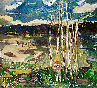 VÅRLANDSKAP MED FLICKA OCH HÄST.