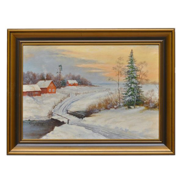 Vinterväg. Vinterlandskap med röda hus i skymning.