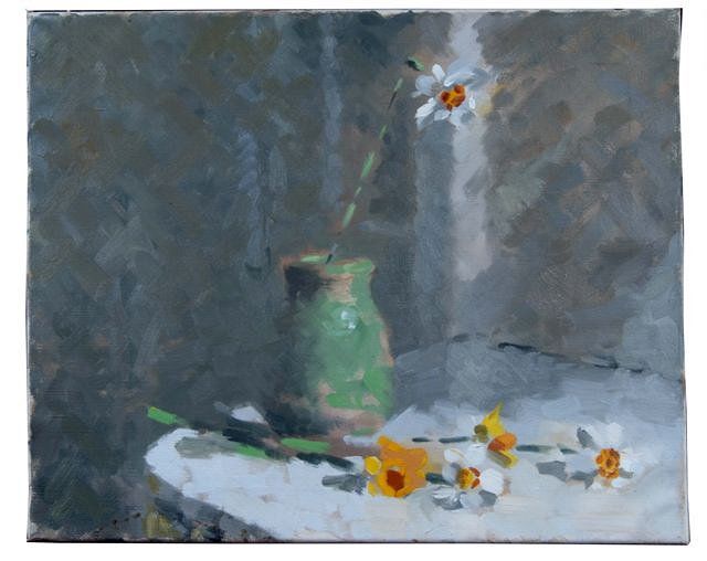 Still life - a green vase with flowers on a table top