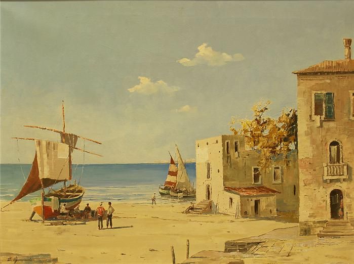 Italienisches Küstendorf mit Fischern an ihren Booten.