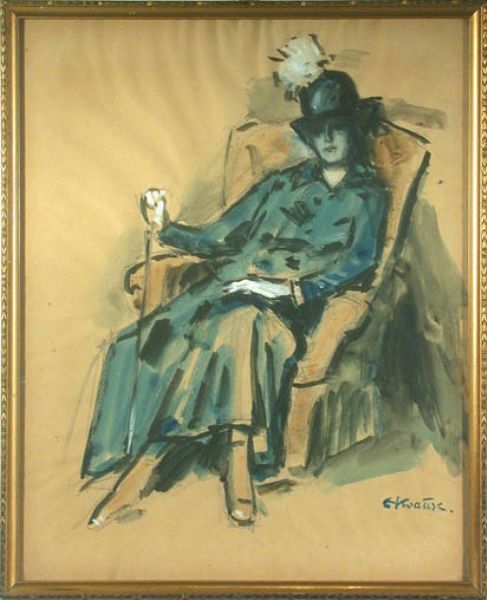 Vornehme Dame im Reitkostüm mit Bowlerhut und Schleier, lässig in einem Sessel sitzend