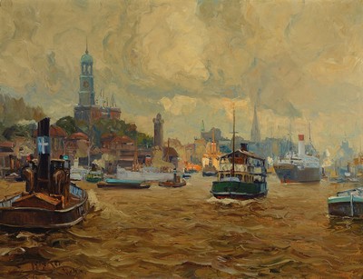 Blick in den Hamburger Hafen, im Hintergrund die Michaeliskirche