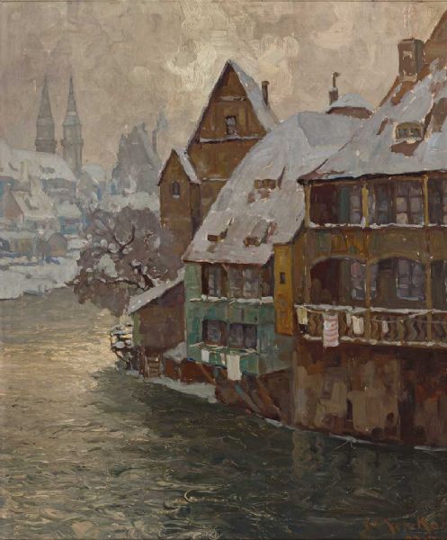 Blick über die Pegnitz auf das verschneite Nürnberg mit Lorenzkirche im Hintergrund.