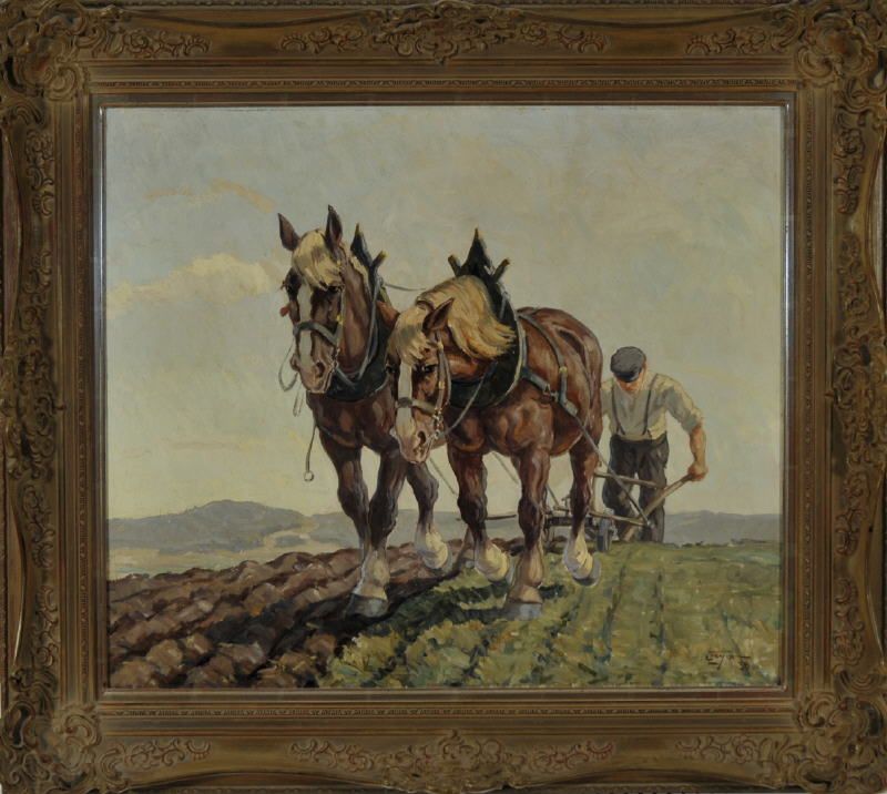 Bauer mit Pferdegespann beim Pflügen des Ackers