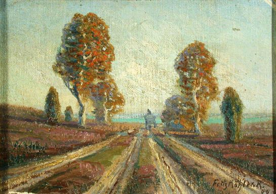 Von Bäumen gesäumter Fahrweg in der weiter Heidelandschaft