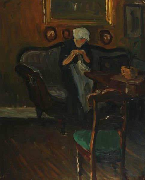 Interior with sewing woman.