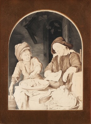 | Kitchen interior with a boy taking food from a sleeping woman | |