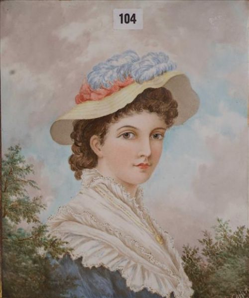 a shoulder length portrait of a young lady wearing a straw bonnet Porcelain