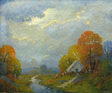 AUTUMN LANDSCAPE WITH COTTAGE BY A STREAM