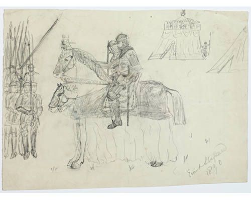 | Two knights on caparisoned horses with pikemen in attendance, a tournament tent in the background | |