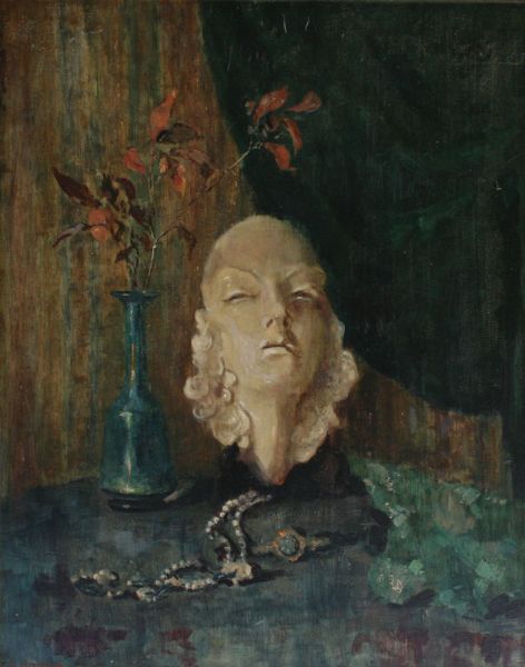 Still life with Sculpture and Vase with Flowers, Necklace on Table