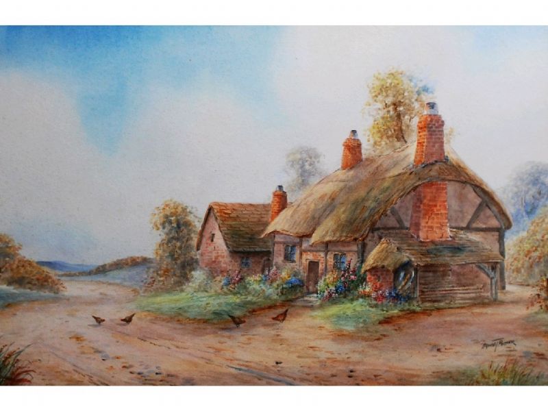 Thatched timbered cottage, cottage garden and chickens on a lane