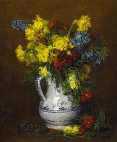 A BLUE AND WHITE VASE WITH MIXED FLOWERS