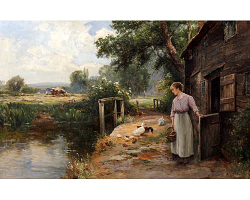 | A young woman with ducks by a barn with harvesting beyond | |