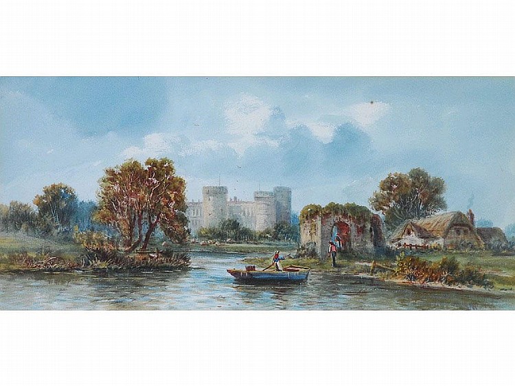A river landscape with figures, thatched cottage and castle