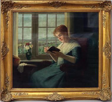 Junges, lesendes Mädchen an einem Fenster mit Blick in blühenden Garten