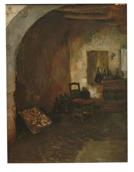 | Blick in einen Gewölbekeller mit zahlreichen Karaffen und Gemüse. | |