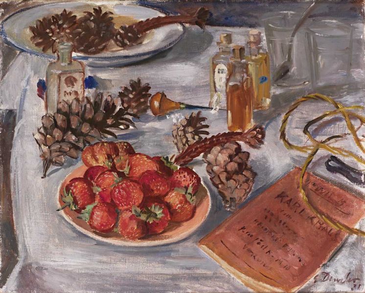 Stilleben mit Erdbeeren, Tannenzapfen, versch. kleinen Flaschen und einem Buch von Karl Kraus.