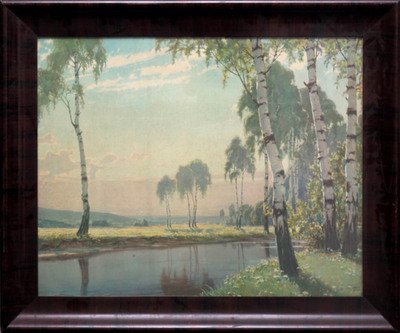 Birkengesäumtes Flüsschen im Rheintal, im Hintergrund die Vogesen