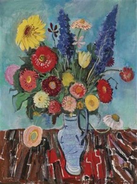 Blue jug with bouquet of flowers