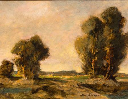 | Besonnte summer landscape with picturesque groups of trees and a distant church village | |