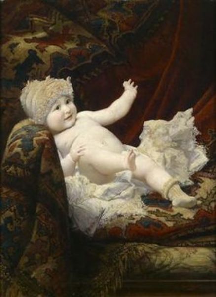 Portrait of a Baby on a Sofa Wearing a Lace Cap