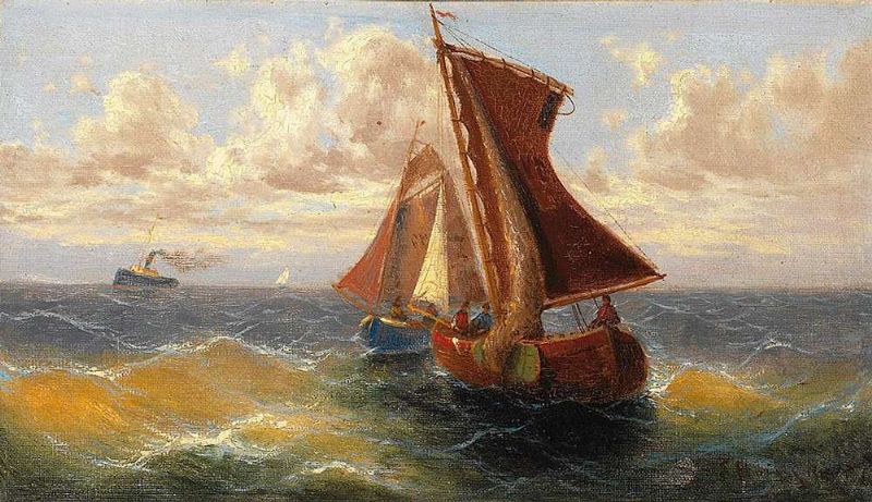 Marine mit Fischer-/Segelbooten und vorbeiziehendem Dampfer