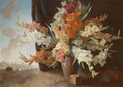 | Large still life with gladioli and wooden dice in front of a window with a view of mountains | |