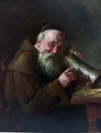 A monk with his ear to a stein