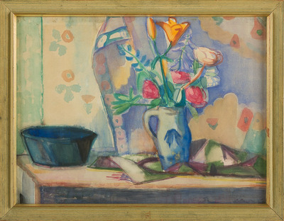Blumen in Keramikvase, neben Schale und Vorhang
