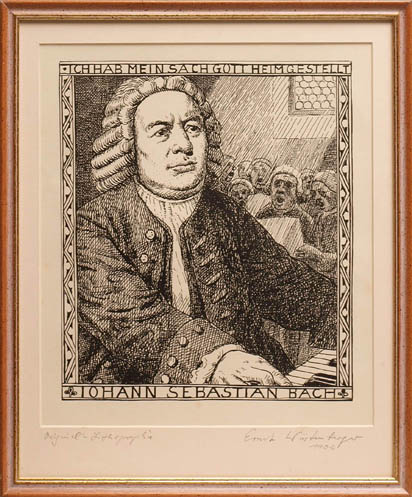 Portrait von Johann Sebastian Bach an der Orgel, im Hintergrund der Thomanerchor