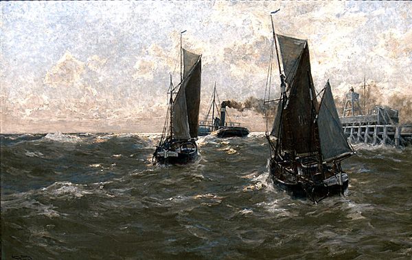 Segler und Dampfschiff auf bewegter See vor Küstenbefestigung
