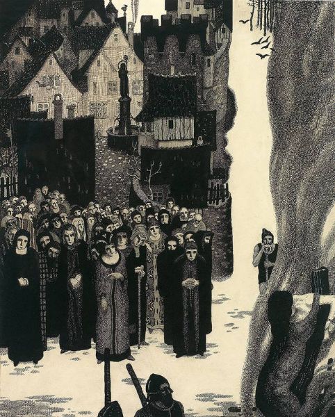 Hexenverbrennung vor Marktplatzkulisse mit zahlreichen ergriffenen Bürgern