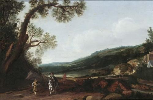 | AN EXTENSIVE HILLY LANDSCAPE WITH TRAVELLERS AND A HORSEMAN ON A PATH | |